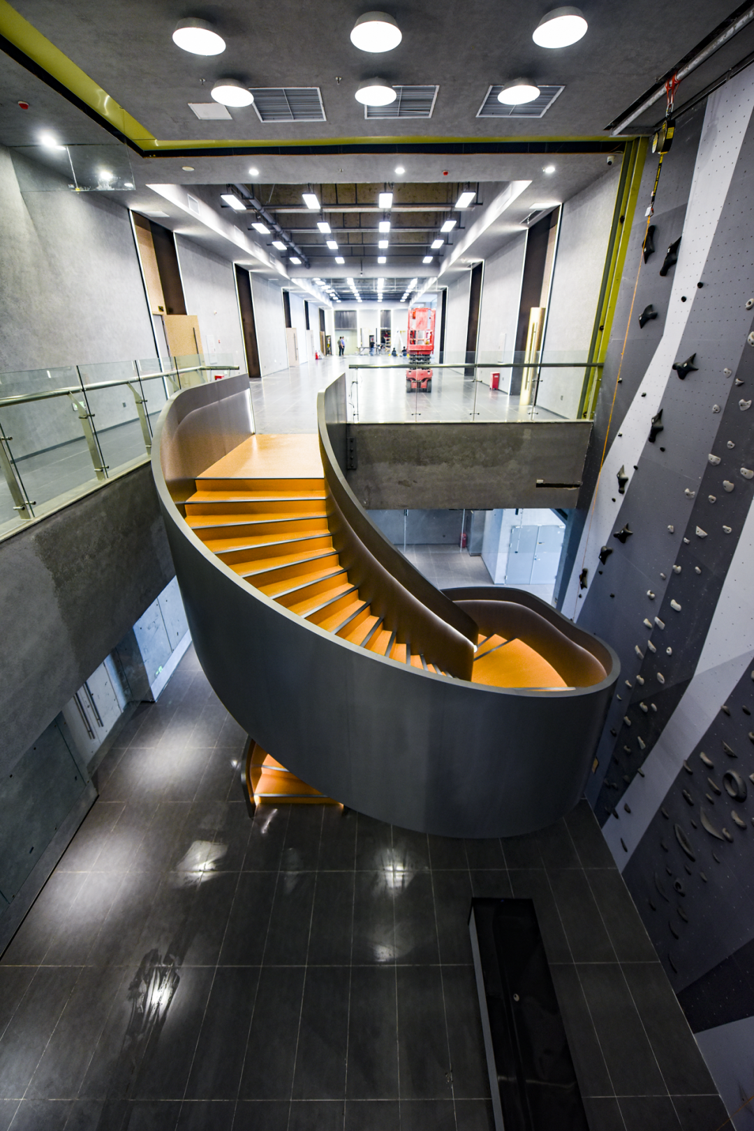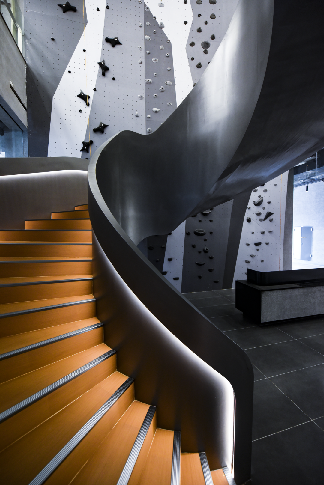 11樓設(shè)置了多功能室(可容納300人)、大小會(huì)議室、洽談室等,中庭與12樓相通,設(shè)置了旋轉(zhuǎn)樓梯和攀巖墻,寓意企業(yè)步步高升,體現(xiàn)企業(yè)家永攀高峰的精神。12樓主要以企業(yè)服務(wù)區(qū)、會(huì)客室為主。