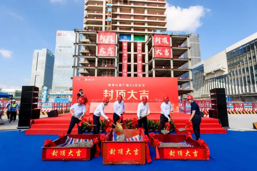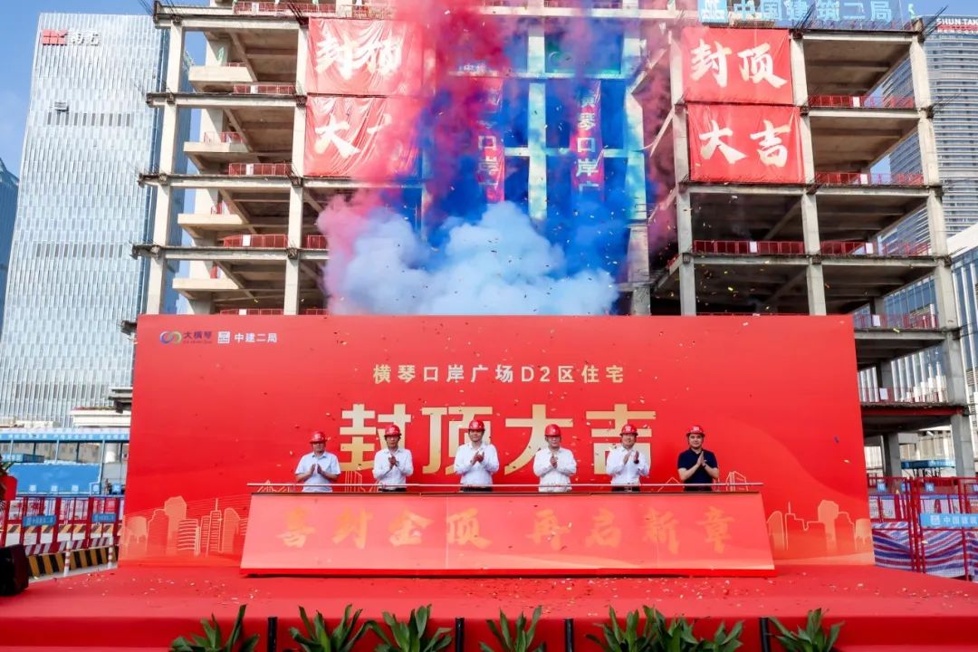 9月27日上午,由珠海大橫琴集團有限公司(以下簡稱大橫琴集團)下屬企業珠海大橫琴口岸實業有限公司建設的橫琴口岸D2區住宅主體結構順利封頂。大橫琴集團黨委副書記、董事、總經理王宇聲,中建二局華南公司黨委書記、董事長曲紅波,大橫琴集團總經理助理呂海濤等領導嘉賓出席儀式,各參建單位代表及項目一線職工共計100余人參加活動。