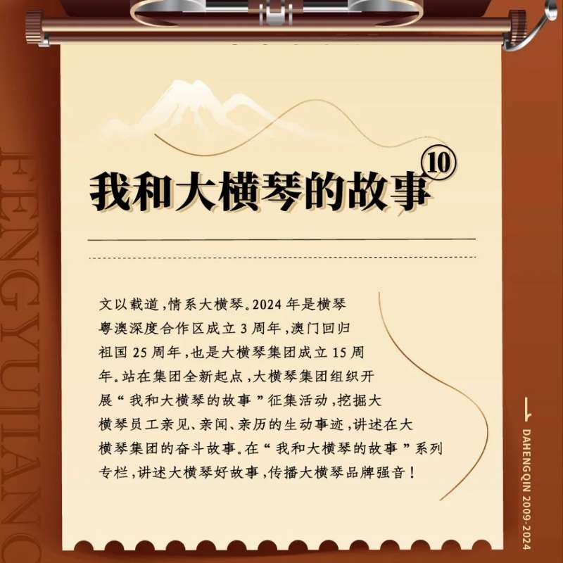文以載道,情系大橫琴。2024年是橫琴粵澳深度合作區(qū)成立3周年,澳門回歸祖國25周年,也是大橫琴集團(tuán)成立15周年。站在集團(tuán)全新起點(diǎn),大橫琴集團(tuán)組織開展“我和大橫琴的故事”征集活動,挖掘大橫琴員工親見、親聞、親歷的生動事跡,講述在大橫琴集團(tuán)的奮斗故事。大橫琴集團(tuán)公眾號將陸續(xù)推出“我和大橫琴的故事”系列專欄,講述大橫琴好故事,傳播大橫琴品牌強(qiáng)音!